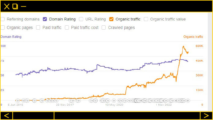 We helped this client skyrocket their organic traffic to over 600,000 visitors/month while steadily increasing their Domain Rating—proof of long-term SEO authority and visibility.